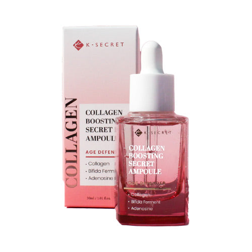 The K-Secret Collagen Boosting Secret Age Defender Ampoule (30ml) is a Korean skincare product designed to enhance skin elasticity, hydration, and overall appearance. Formulated with marine collagen, bifida ferment lysate, and adenosine, it aims to provide anti-aging benefits and improve skin texture.