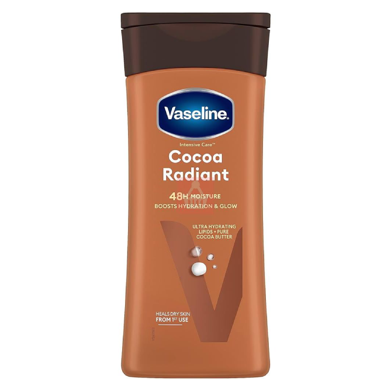 Vaseline Intensive Care Cocoa Radiant Body Lotion deeply moisturizes, nourishes, and restores dry skin, leaving it soft, smooth, and naturally radiant.